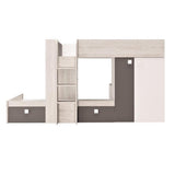 Flere innovative funksjoner gjør denne vendbare, moderne, plassbesparende køyesengen til et svært ettertraktet alternativ for både barn og foreldre. Øverste køyeseng er forskjøvet fra bunnen, noe som gir bedre sikt på bunnen samtidig som det legger til visuell interesse og stil. Integrert i den ene enden er et romslig garderobeskap med to dører, som fungerer som støtte for øverste seng. Garderobens dybde strekker seg over hele den faktiske sengens bredde på 85 cm, slik at den gir rikelig med lagringsplass for to barn. Skapet har en kombinasjon av hyller og hengeplass. Det er også ekstra hyller over den nedre sengen for å holde bøker eller leker innen rekkevidde. Under den nedre sengen er det to dype skuffer som gir enda mer plass til å rydde bort spill, leker, klær, sko eller sengetøy.