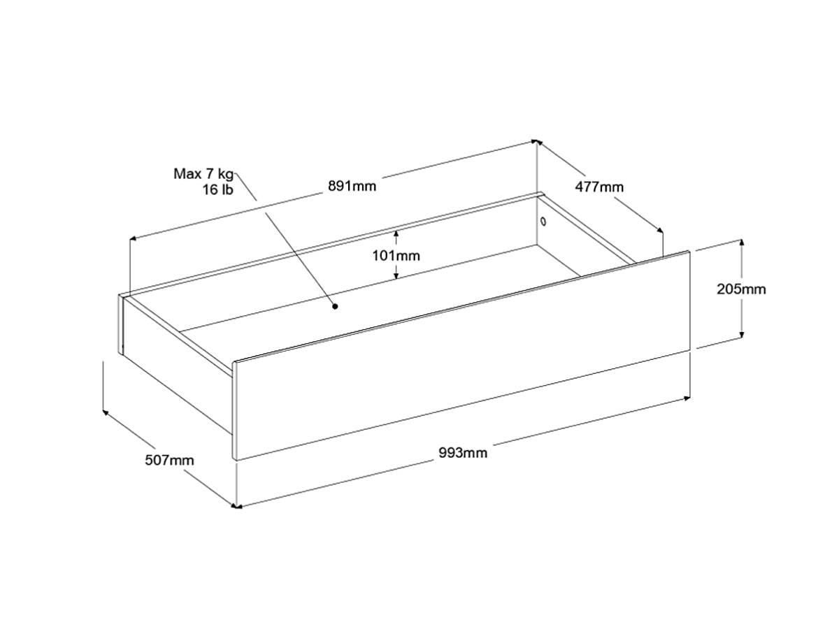 - Skuffemål: 22 x 199 x 51 cm