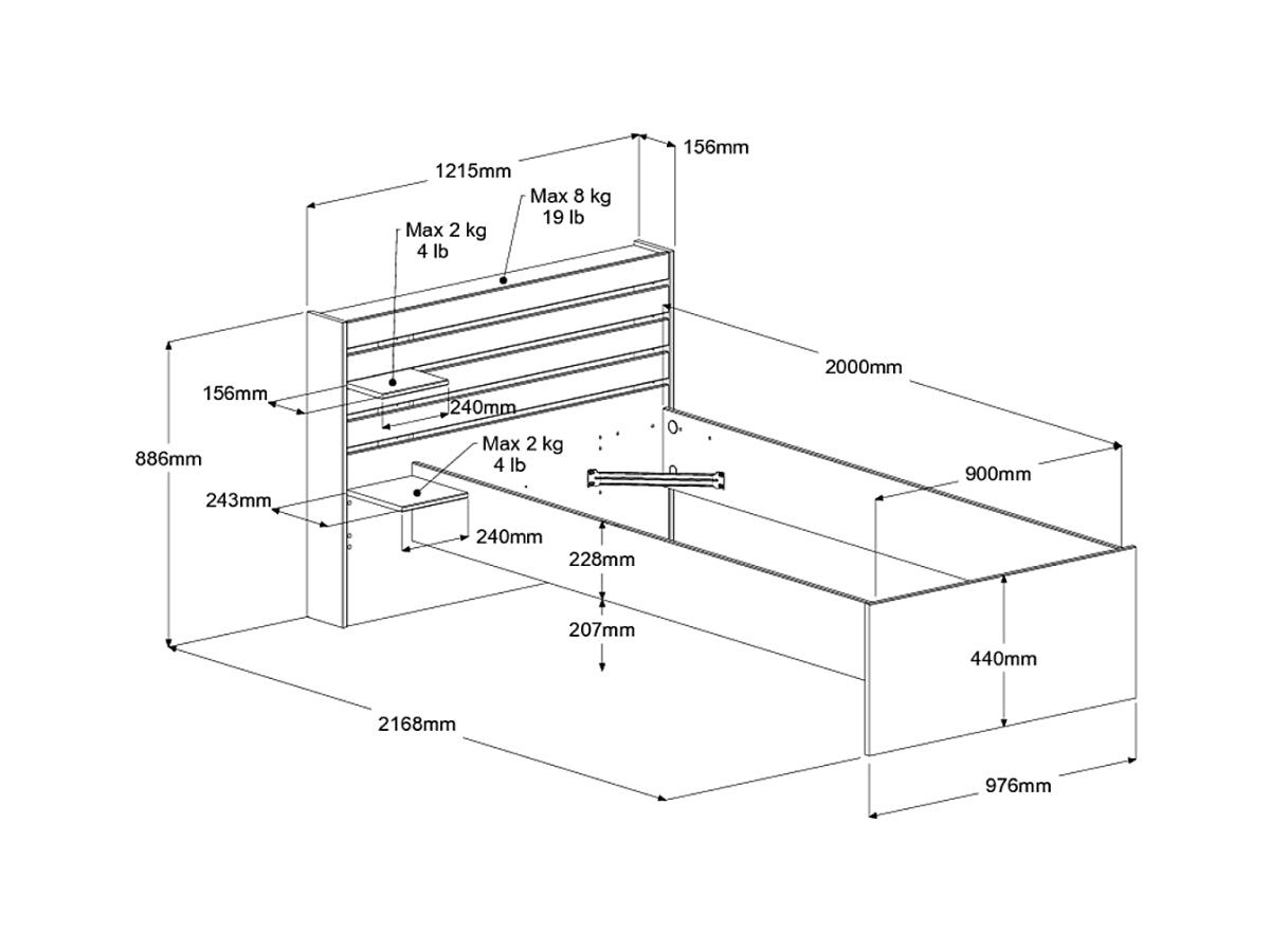 Mål seng: 122 x 89 x 217 cm