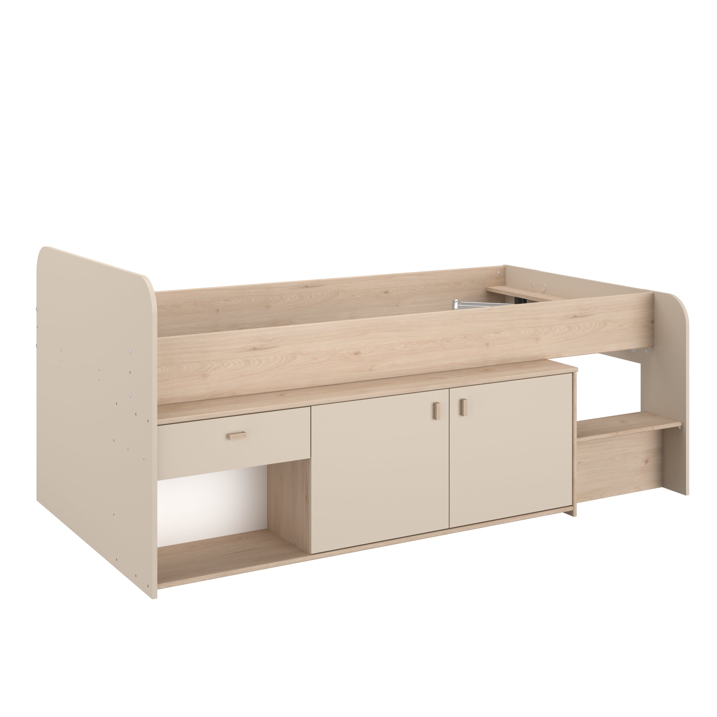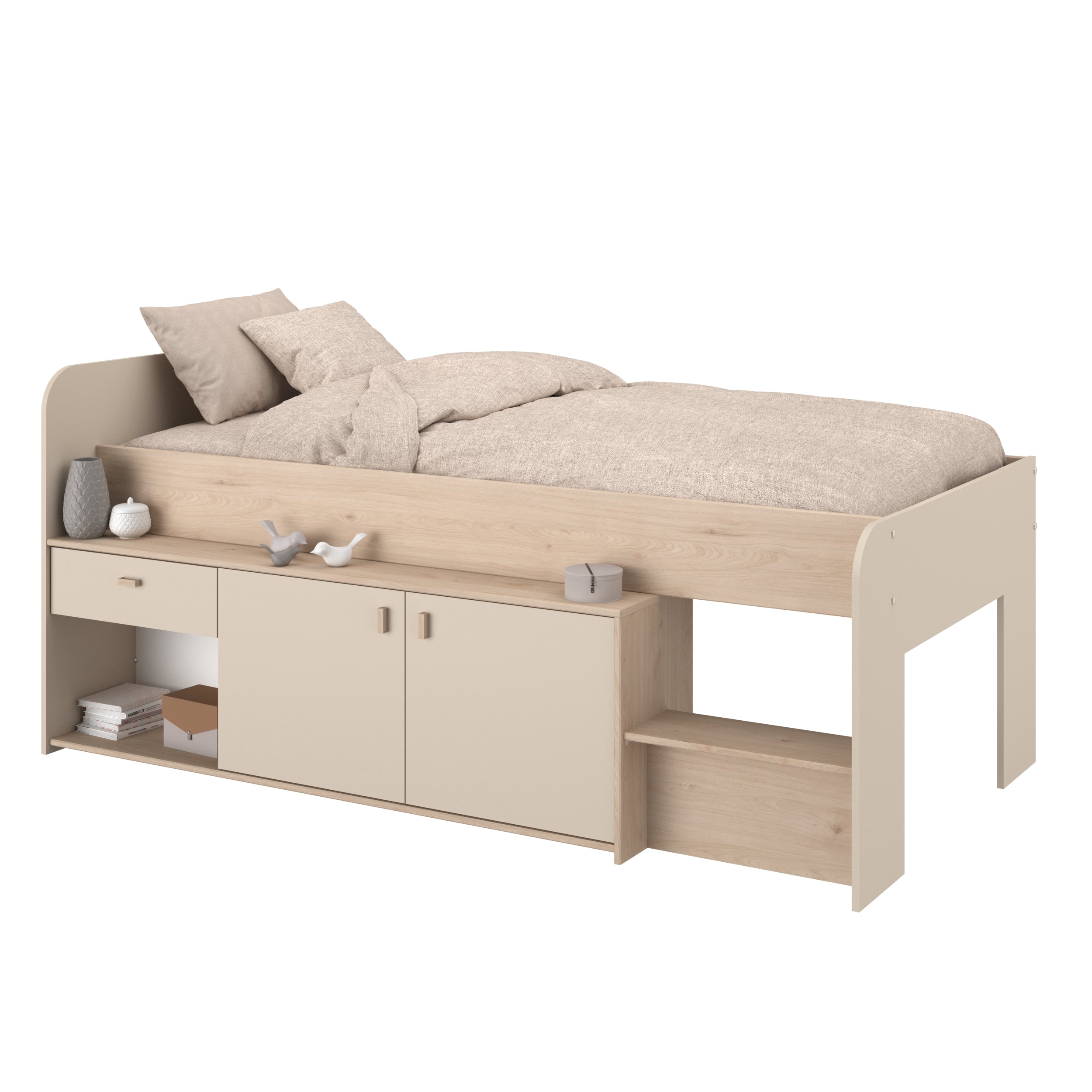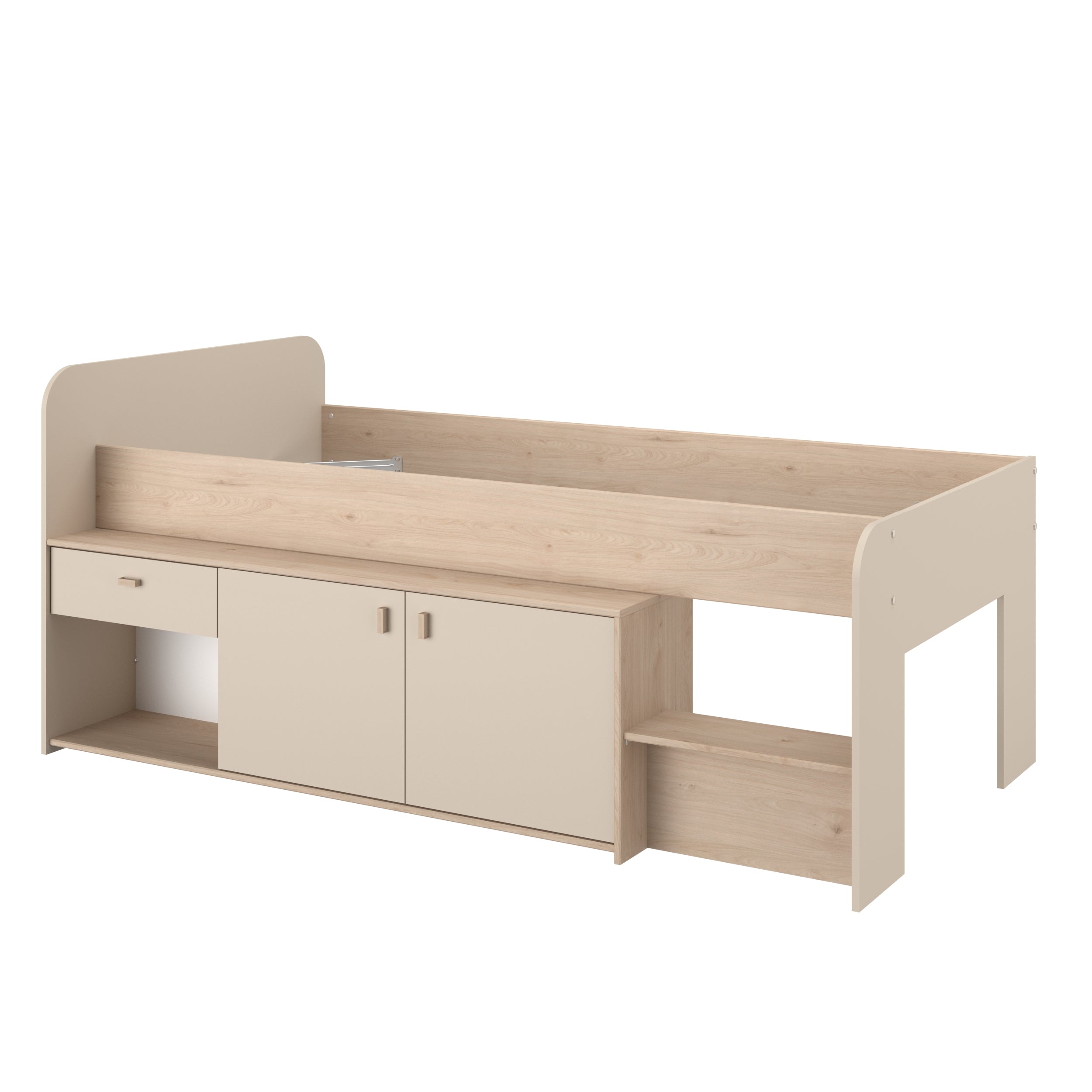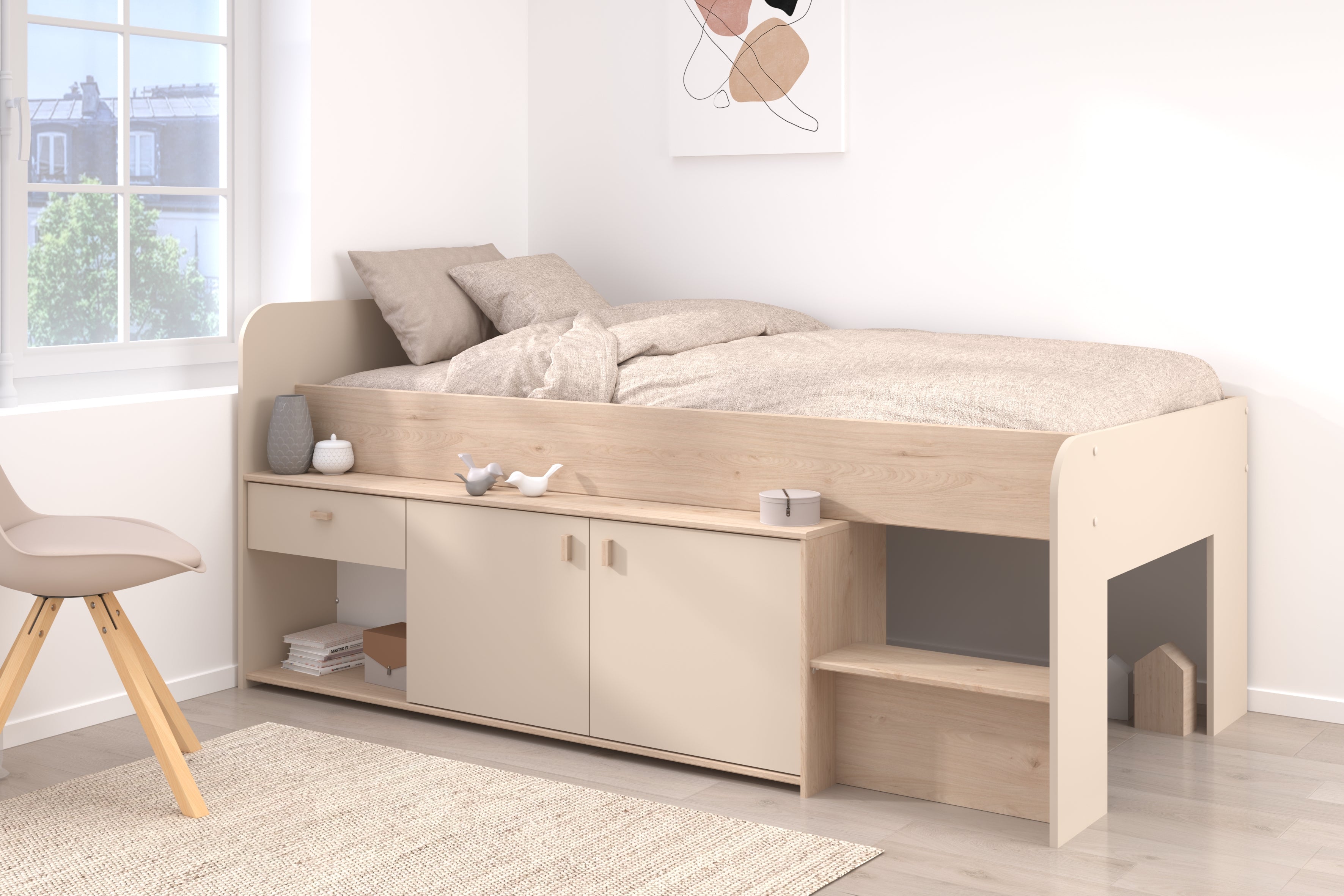 Parisot halvhøy seng med oppbevaring er laget med fokus på kvalitet og funksjonalitet. Den integrerte skuffen gjør det enkelt å holde rommet ryddig, samtidig som designet gir et lyst og moderne uttrykk til barnerommet. Sengen er laget i solide sponplater og har en komfortabel 90x200 cm madrassflate, noe som gjør den til et perfekt valg for både små og større barn.