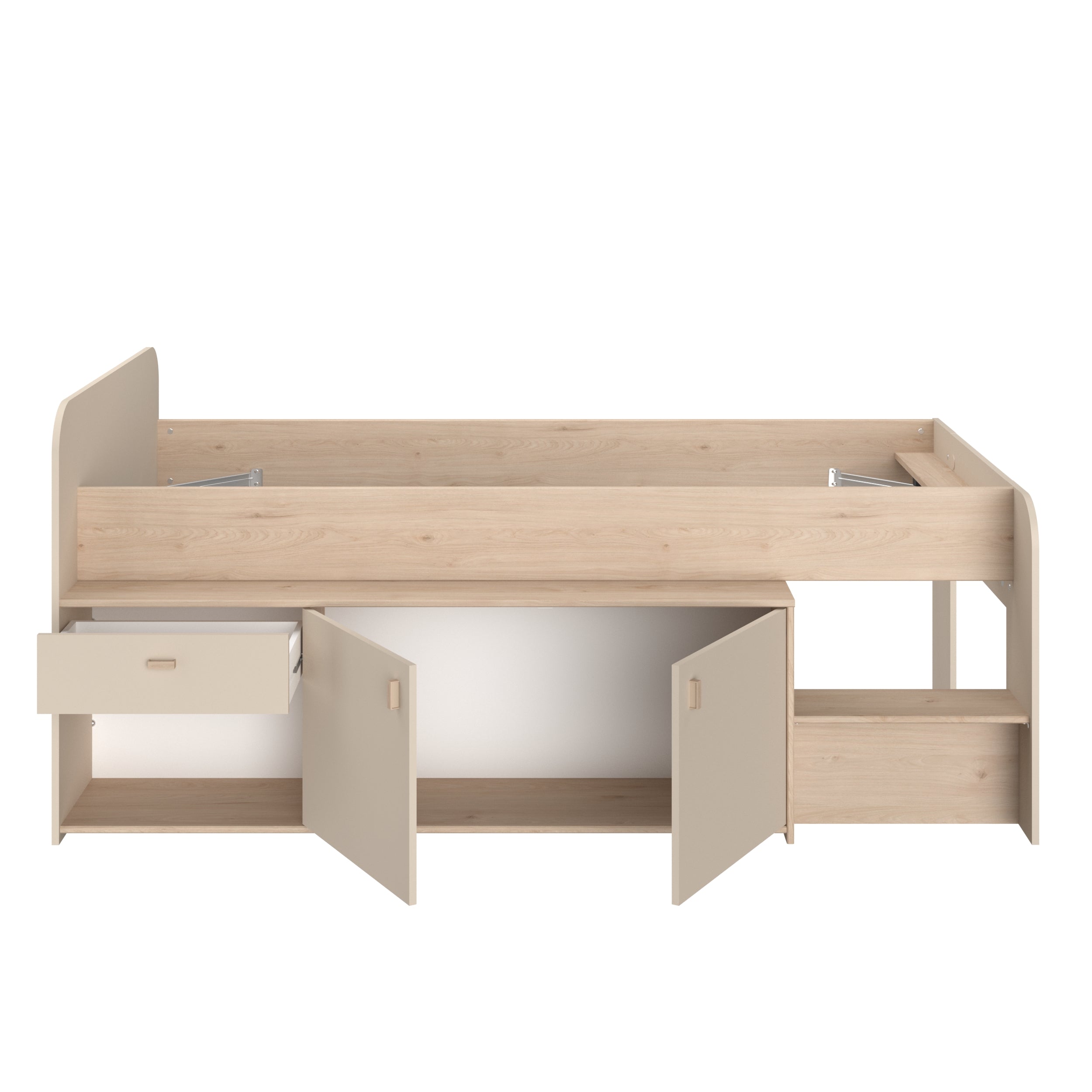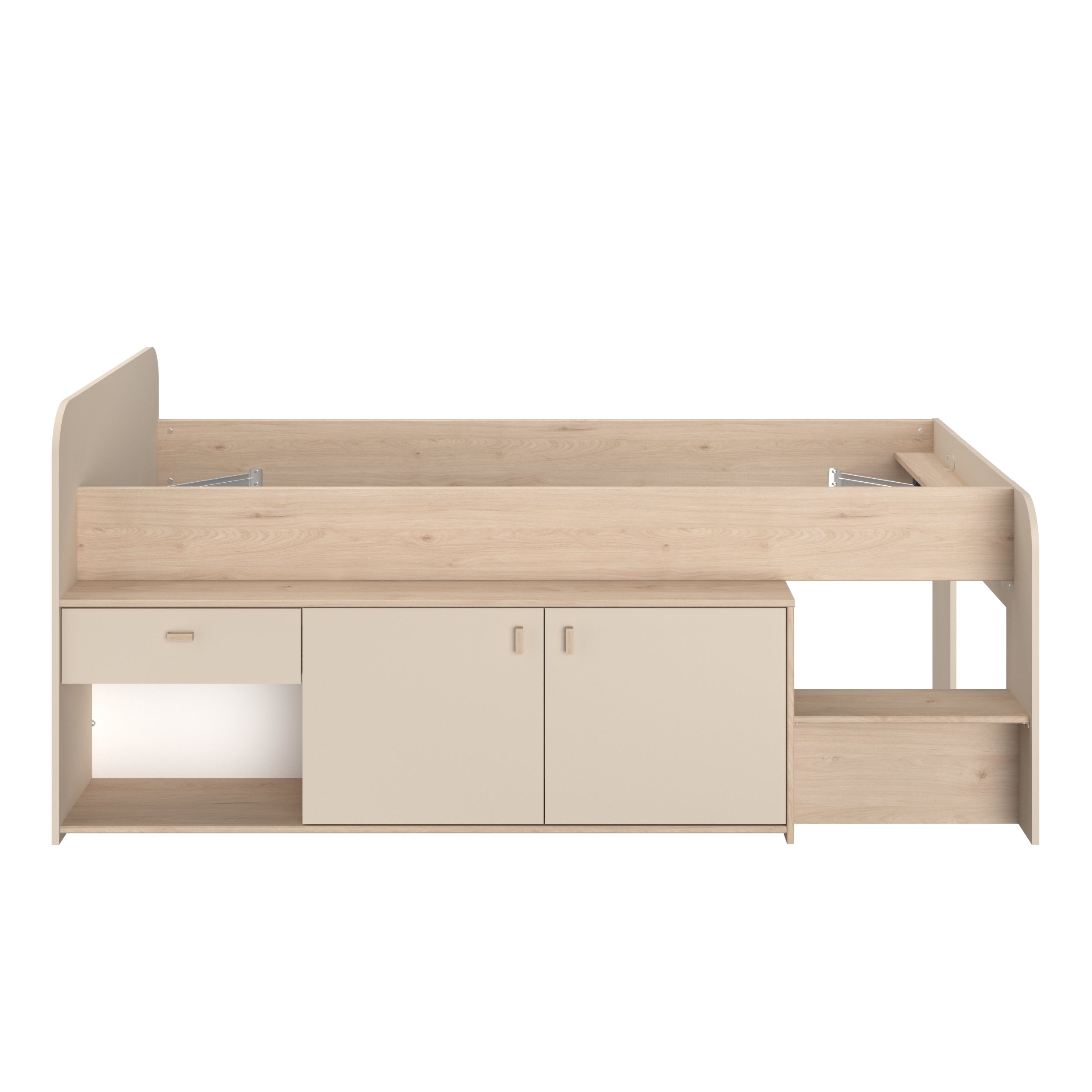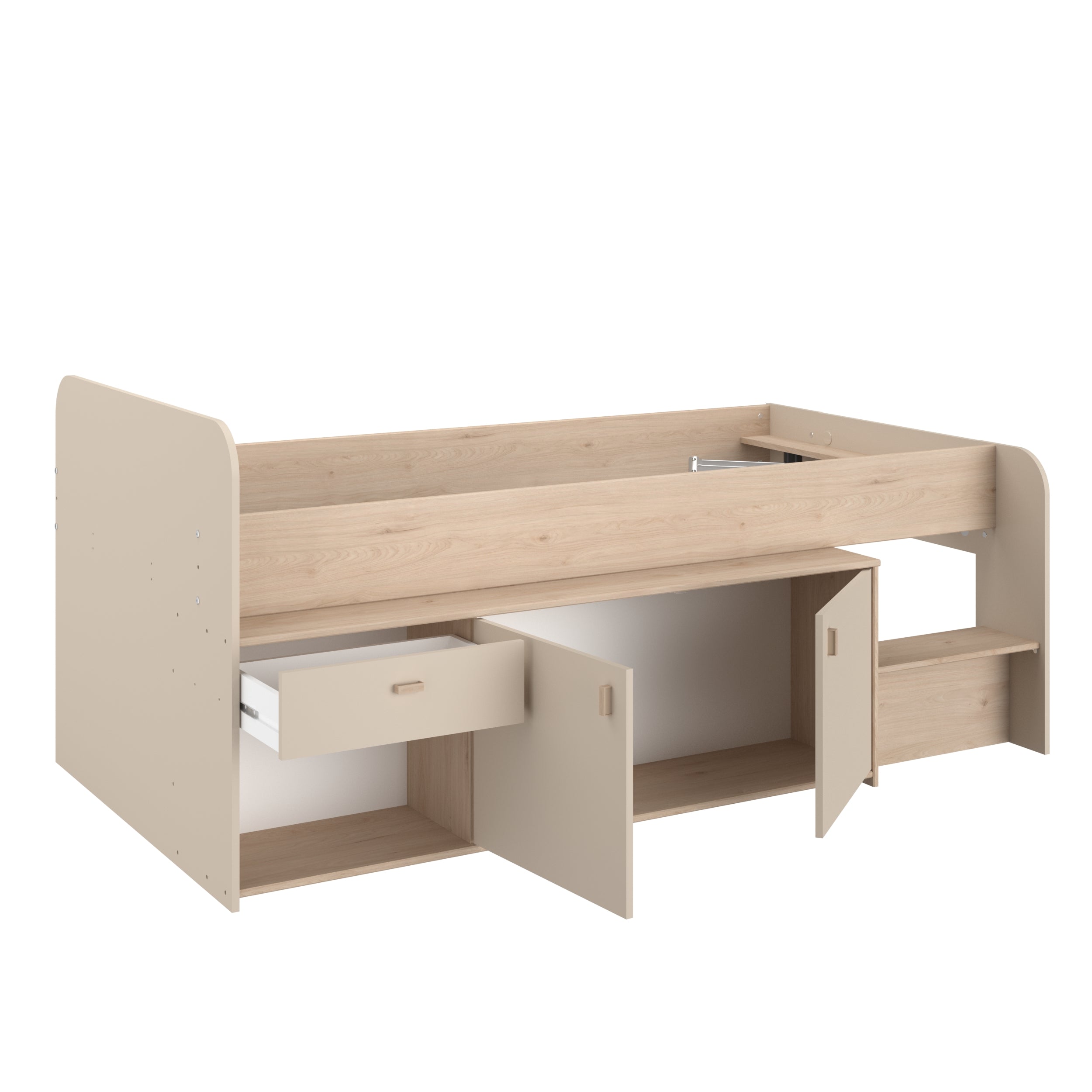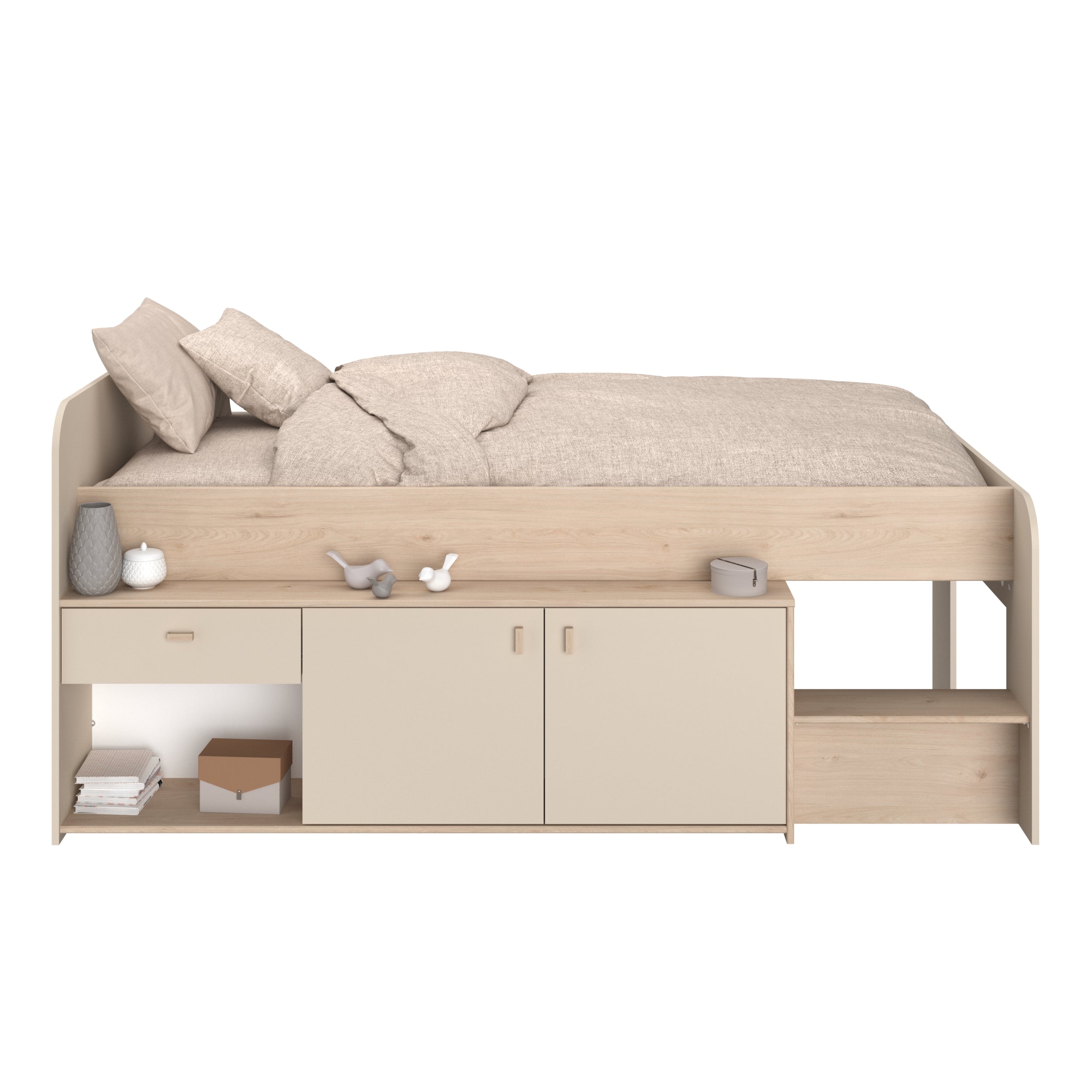 Parisot halvhøy seng med oppbevaring er laget med fokus på kvalitet og funksjonalitet. Den integrerte skuffen gjør det enkelt å holde rommet ryddig, samtidig som designet gir et lyst og moderne uttrykk til barnerommet. Sengen er laget i solide sponplater og har en komfortabel 90x200 cm madrassflate, noe som gjør den til et perfekt valg for både små og større barn.