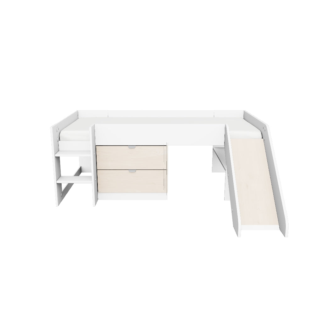 Halvhøy seng med sklie - 90x200 fra fabrikken Parisot, produsert i Frankrike. Lekre fargekombinasjoner i hvit og eikefarge, gjør at dette er en populær seng som passer inn i nordiske hjem.