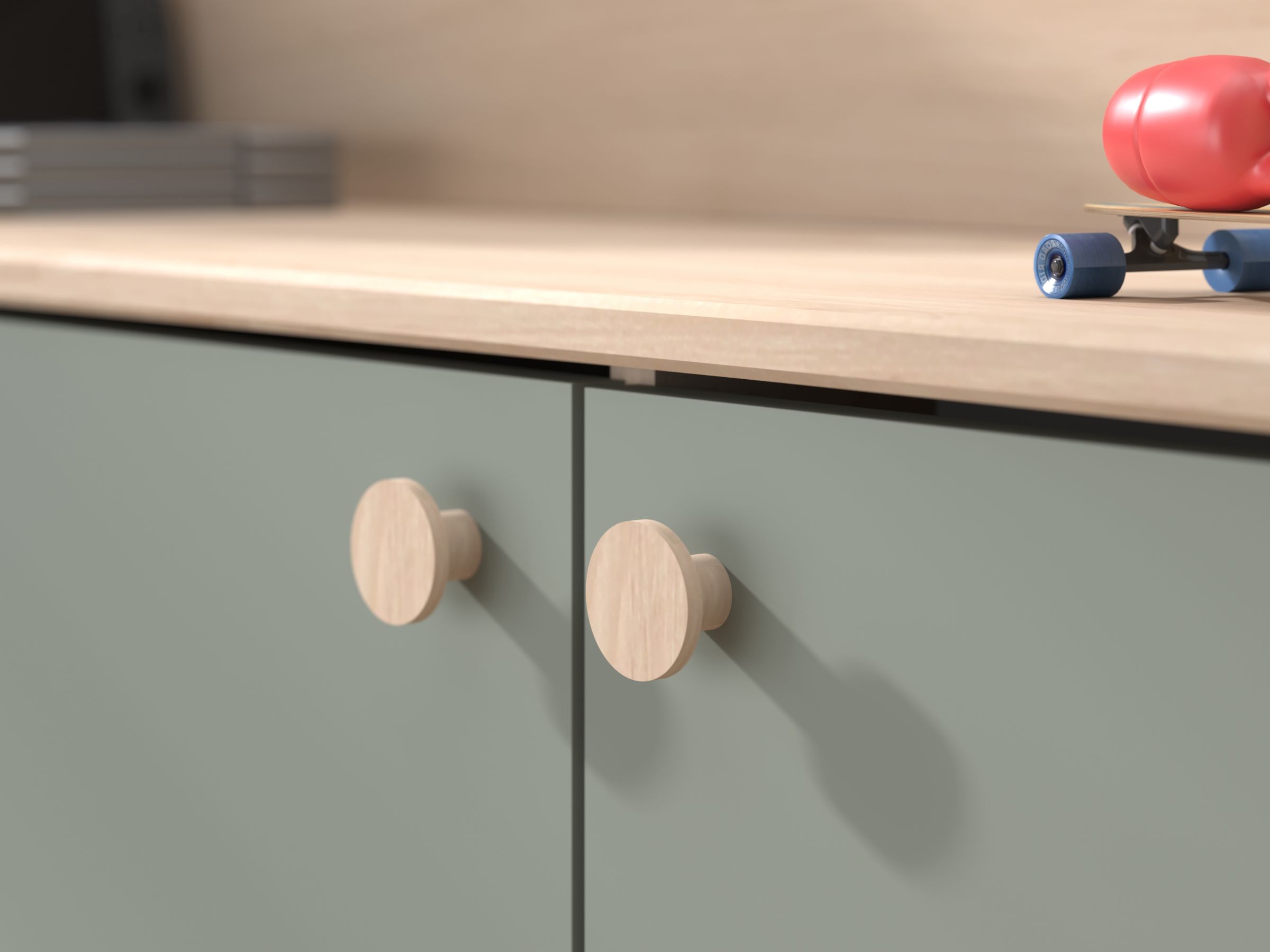To skapdører med runde trehåndtak og åpen oppbevaringsniche