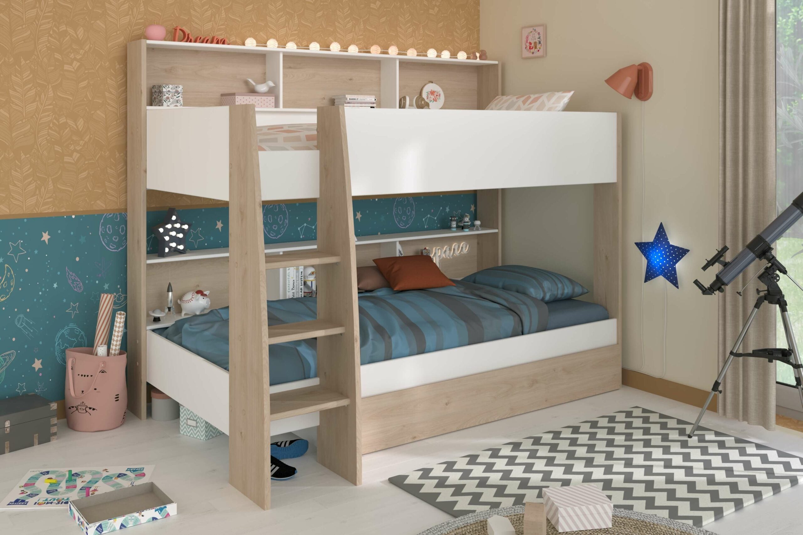 Perfekt seng for barn som deler rom eller for overnattingsfester, denne moderne og praktiske køyesengen fra Parisot har et stilig utseende som aldri går av moten! Denne køyesengen vil være et flott tillegg til barnets soverom, spesielt hvis du har et lite rom der plassen kan være begrenset. Hver etasje har sin egen oppbevaringsenhet med 3 praktiske rom for å holde nødvendigheter innen rekkevidde ved sengetid. Bakpanelene for hver hylleenhet er tosidige og er ferdige i hvit og Brooklyn-eik. Da de er helt reversible, kan du velge ditt foretrukne utseende for hver etasje ved montering – hvor kult er ikke det! Det er også en romslig oppbevaringsskuff under den nederste sengen, som ruller enkelt inn og ut takket være skjulte hjul – perfekt for å holde leker eller sengetøy pent ute av syne. Parisot har nesten 90 år lang tilstedeværelse på det internasjonale møbelmarkedet.