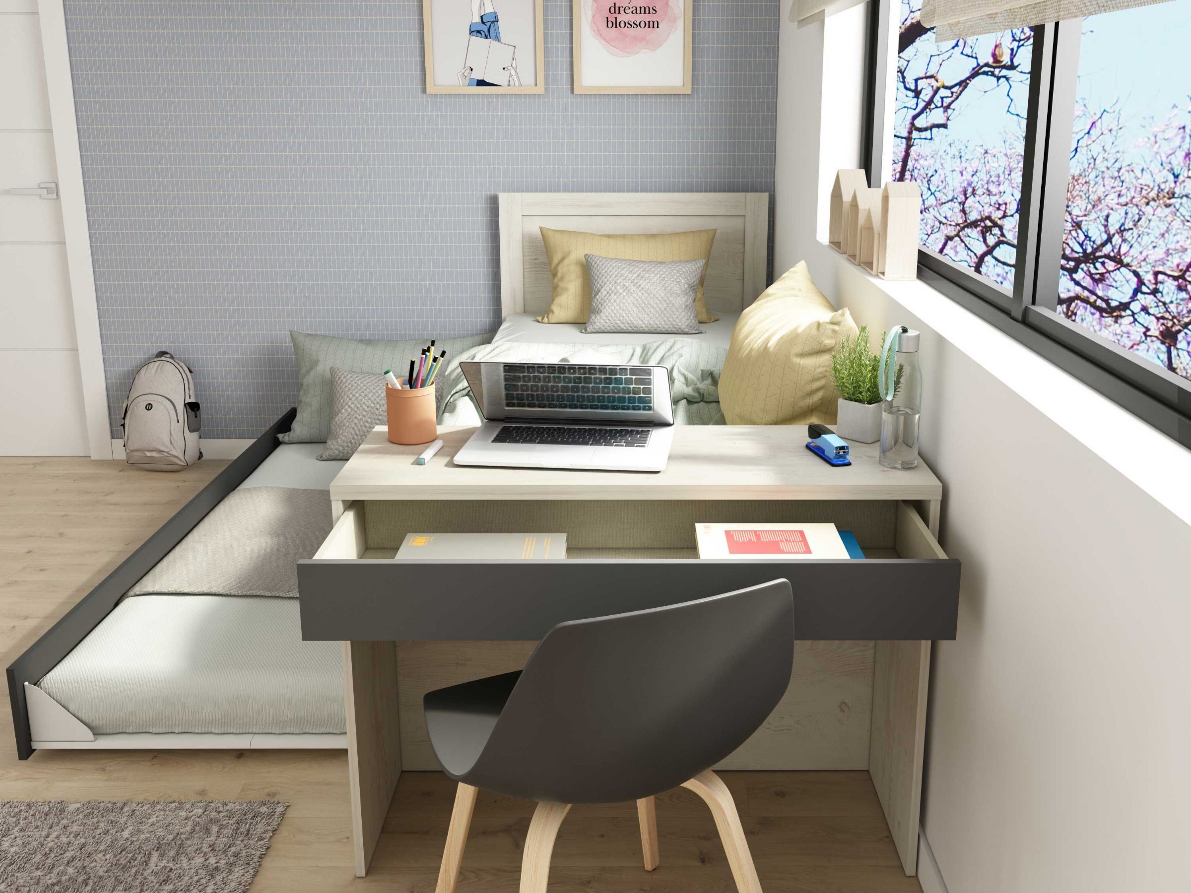 Integrert skrivebord: Plass til lekser og kreative aktiviteter, med romslig skuff for oppbevaring.