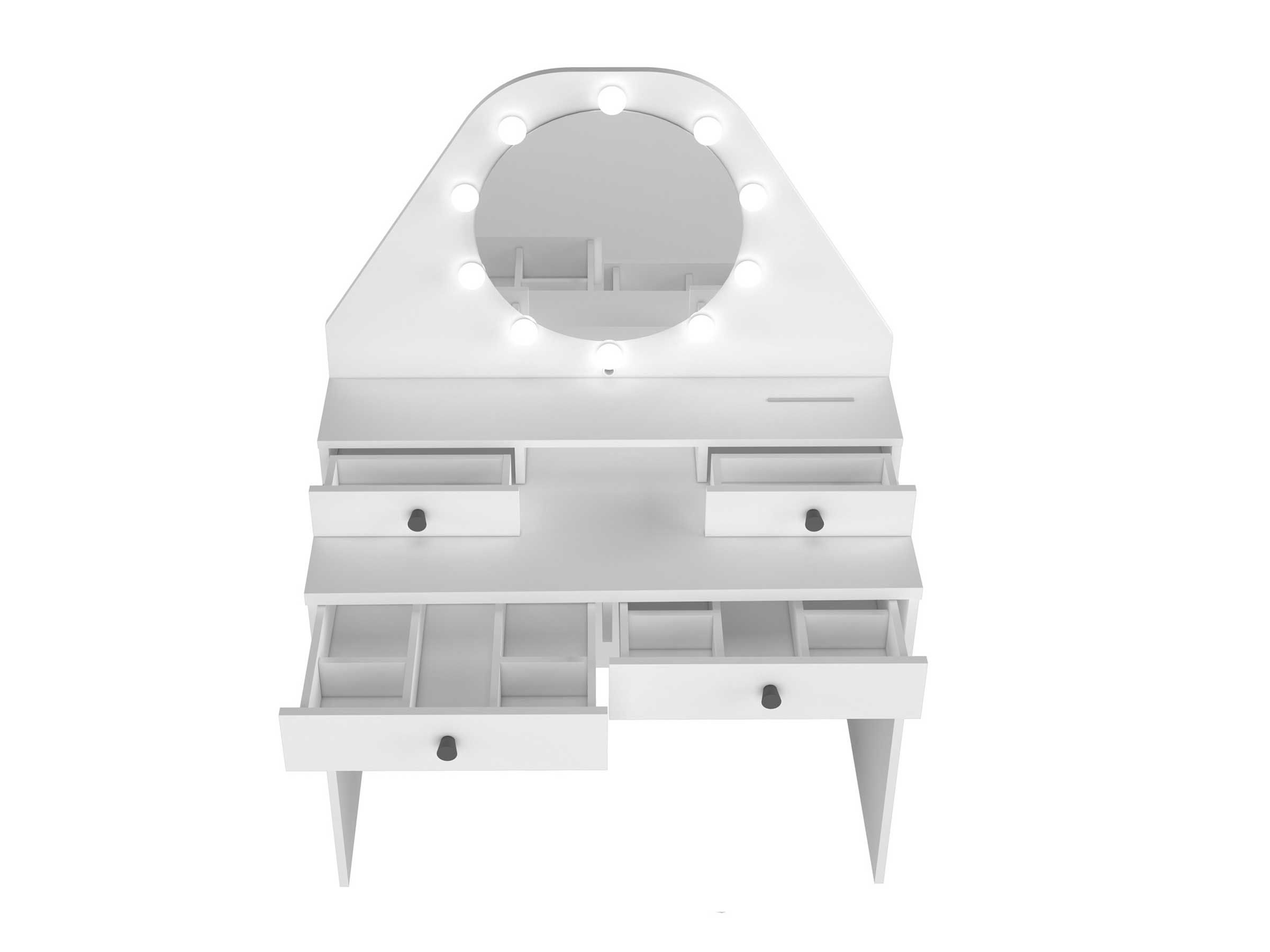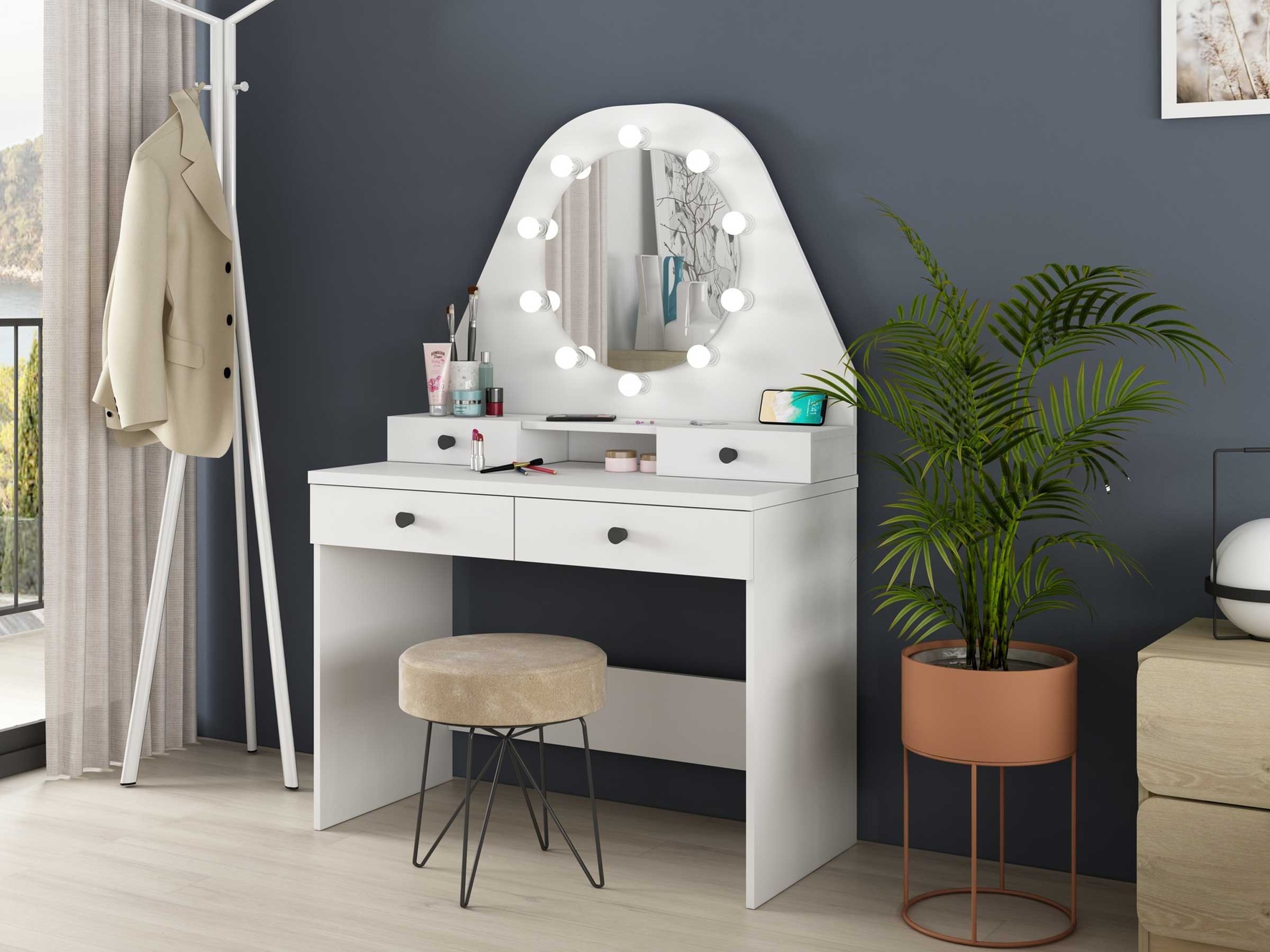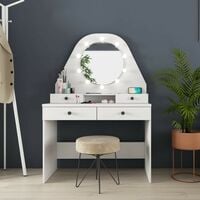 Sminkebordet har 10 LED lys som lyser opp skjønnhetsplassen og omkranser et flott, stort rundt speil. Disse lysene kan også dimmes. Du kan altså sikre deg gode lysforhold når du skal ordne deg for dagen, noe vi vet er alfa og omega.