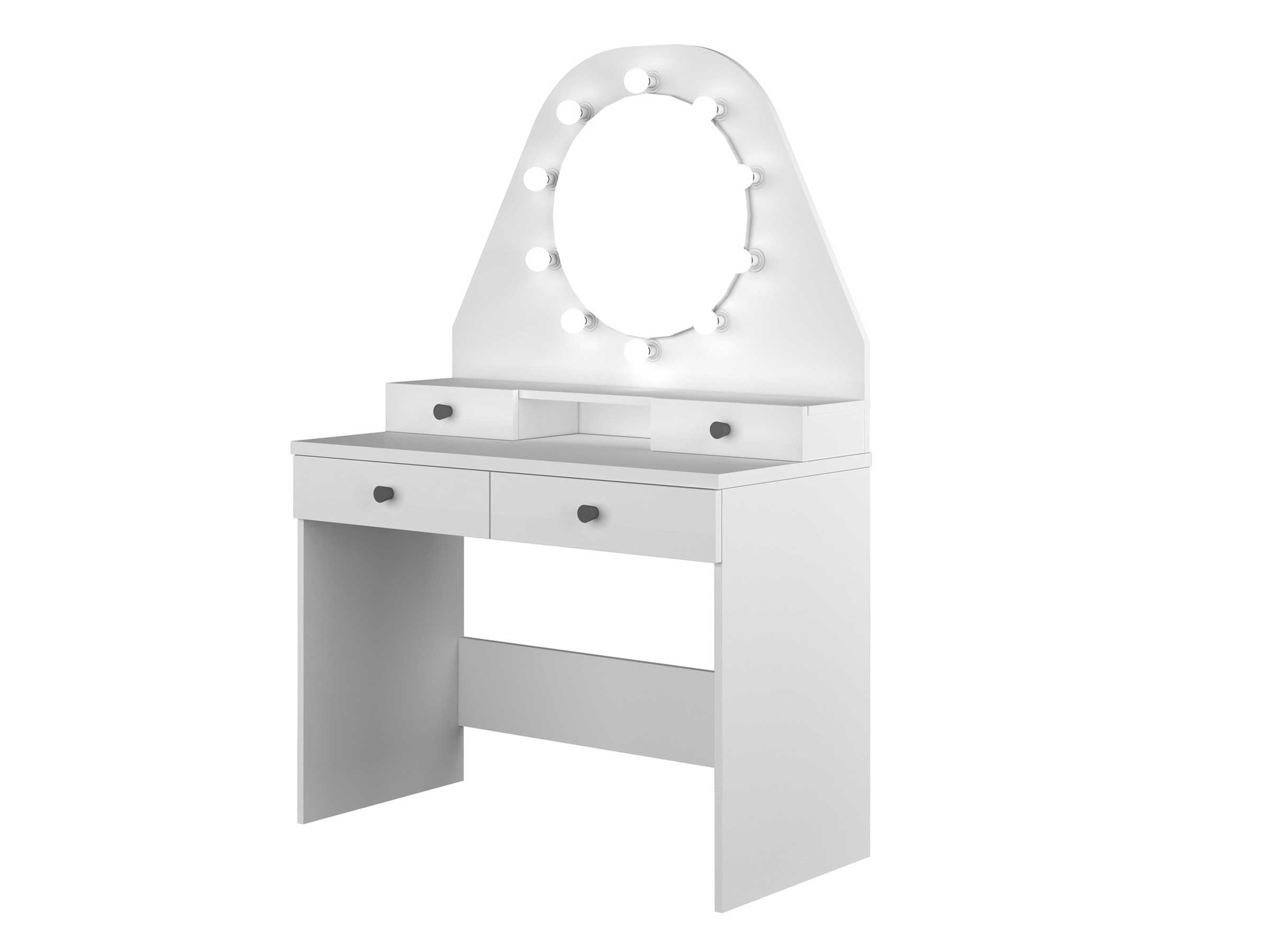 Sminkebord Star - Trasman hvit, er et flott og klassisk sminkebord som passer jenter i alle aldre. Med et stort rundt speil omkranset av kuleformede LED-lys, vil dette møbelet bringe sjarm og løfte et hvert rom. De 4 romslige oppbevaringsskuffene gjør det enkelt og organisere alt av skjønnhetsprodukter.